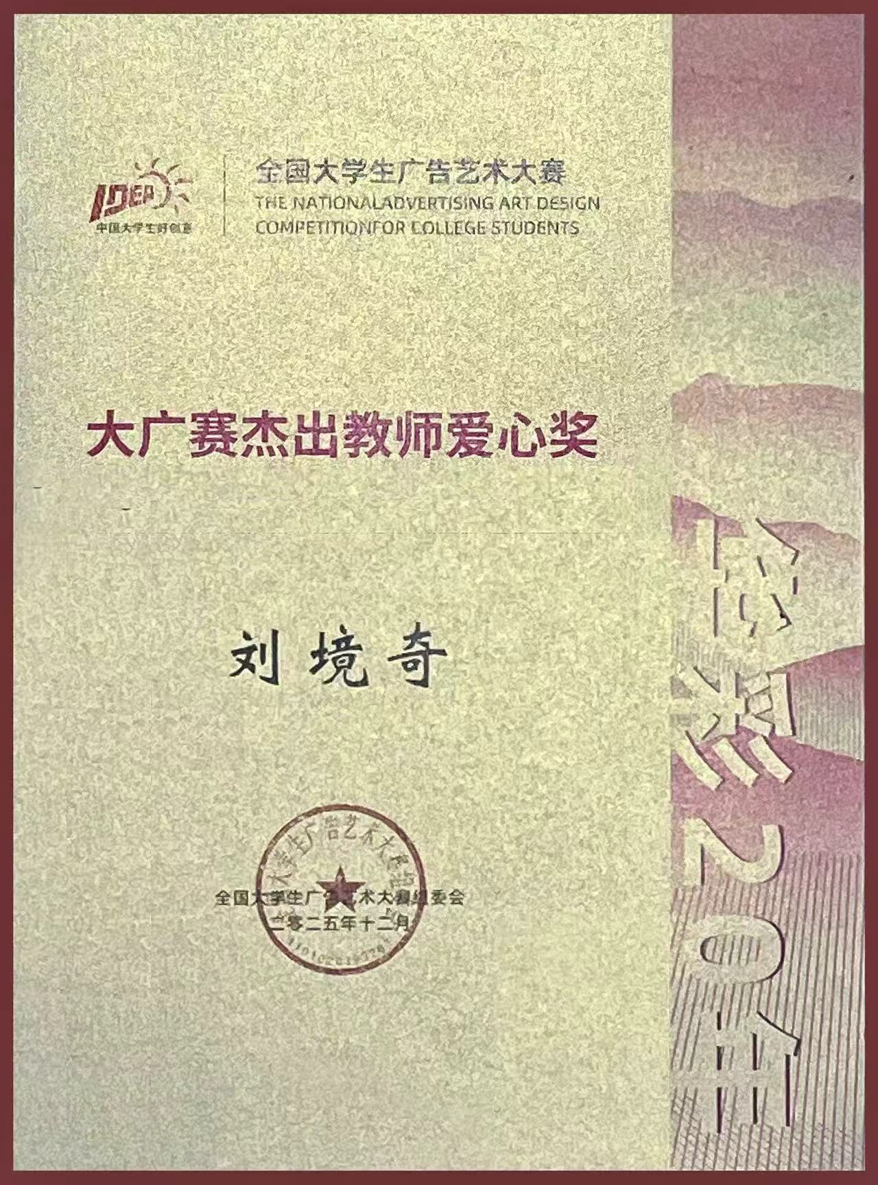 据悉,为表彰二十年来深耕赛事指导、助力青年创意成长的优秀教育工作者,组委会从全国1900余所参赛高校中严苛遴选,最终仅评选出15位“杰出教师爱心奖”获得者。此次获奖,既是对刘境奇教授二十载深耕大广赛指导一线、坚守广告教育初心的最佳回馈,更是对其在广告教育创新与应用型人才培养领域突出成果的高度认可。在其引领下,我校艺术与设计学院始终秉持“用手去思考”的核心教学理念,扎实推进“四课联动”教学改革,构建了特色鲜明的实践育人体系。未来,学院将继续以大广赛等高水平竞赛为重要平台,深化产教融合、推进赛教结合,持续完善实践育人机制,助力学子锤炼真才实学、激发创新潜能,为广告行业及相关领域输送更多兼具创新精神与实践能力的高素质特色人才。