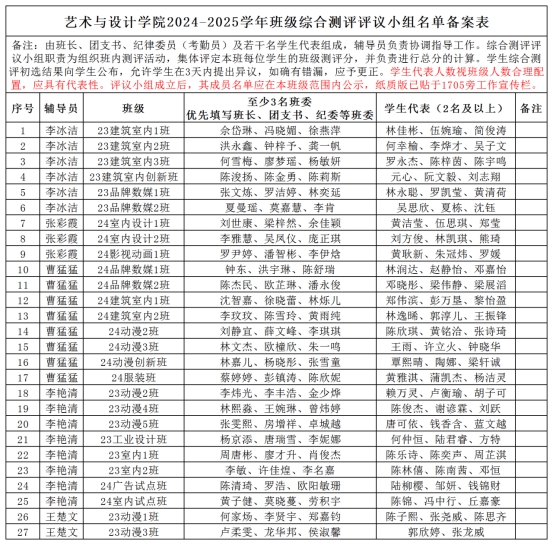 艺术与设计学院2024-2025学年班级综合测评评议小组名单备案表